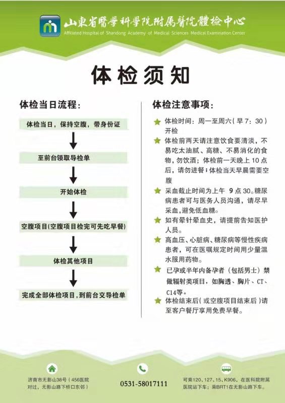 (二)體檢地點(diǎn):山東省醫(yī)學(xué)科學(xué)院附屬醫(yī)院體檢中心(位置:濟(jì)南市無(wú)影山38號(hào)(456醫(yī)院對(duì)面)1號(hào)樓查體中心);